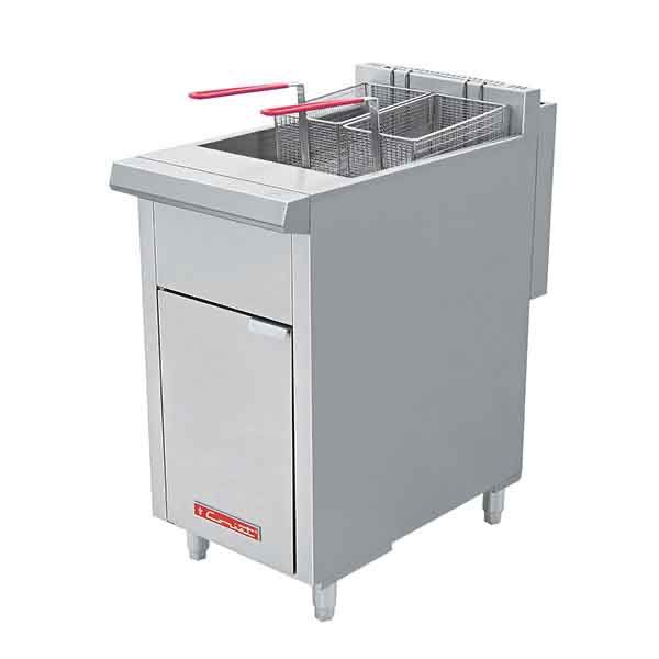 2 canastillas niqueladas con asa plastificada, medida interior de cada una. 4 quemadores de recuperación inmediata en hierro fundido. Termostato con rango de temperatura de 100 a 220°C. Válvula de seguridad electromecánica millivolt. Control hi-limit de protección térmica calibrado a 232°C. Zona fría al fondo que extiende la vida útil del aceite. 1 parrilla de alambrón niquelado para captar residuos. Válvula de drenado de 1″ de ø en la parte baja. 4 patas tubulares niveladoras en acero inoxidable.
